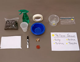 - Point out the group poster. Tell children that they will be working together as a group to plant and care for their bean seeds and to take photos of them as they grow. Point out the color label on the poster, the plastic bag, and the plastic container.
